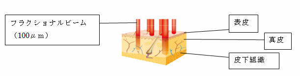 微細なレーザービームを高密度に真皮に侵達させていき、周辺組織を傷つけることなく、表皮から真皮の特定の深さにレーザーによる熱変性した真皮層(Micro Necrotic Column)と呼ばれる熱損傷部位を作り出します。